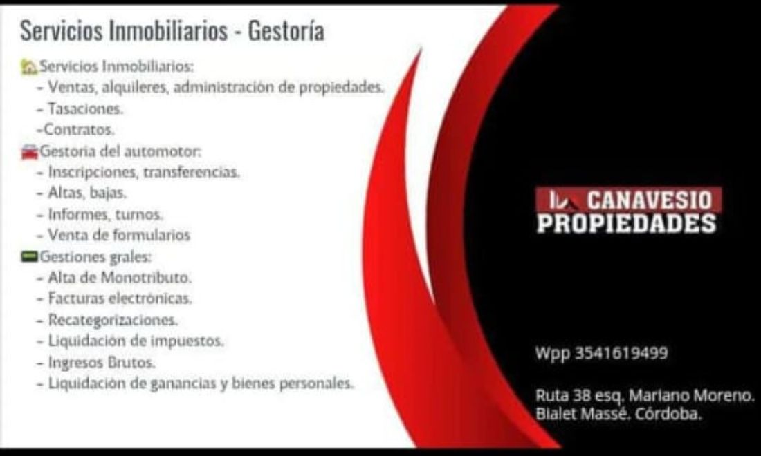 Ubicados en la Ruta 38 esquina Mariano Moreno (frente a la policía), Canavesio Propiedades es una marca de prestigio liderada por Gisela Canavesio, Martillera, Corredora Pública y Mandataria del Automotor. Con una década de experiencia en el mercado de Punilla, nos destacamos por ofrecer un respaldo profesional multidisciplinario. Nuestro equipo se enfoca en construir vínculos de confianza a largo plazo, garantizando transacciones seguras y una atención que combina la seriedad técnica con un trato humano y cercano, acompañándote a encontrar tu lugar en las sierras.