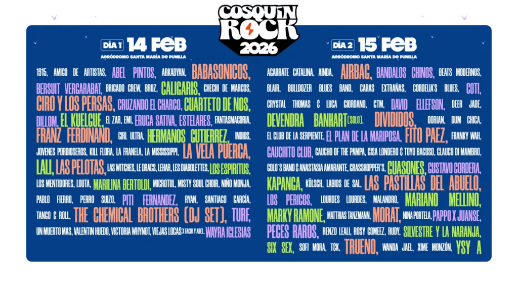 - Domingo 15: La segunda jornada contará con leyendas como Fito Páez, Divididos y Airbag. El trap y el rap tendrán sus momentos más altos con YSY A y Trueno. Además, el Escenario Montaña recibirá a los colombianos de Morat y a las Pastillas del Abuelo, mientras que el Escenario Paraguay tendrá un cierre internacional con el mítico Marky Ramone.