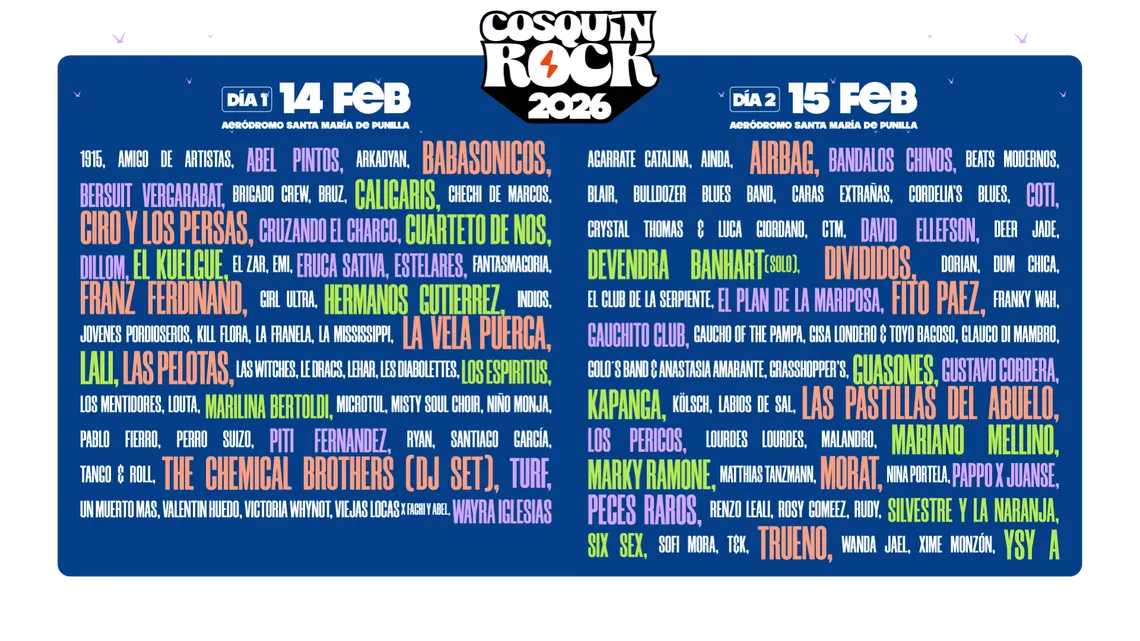 - Sábado 14: El Escenario Norte vibrará con Babasónicos, Lali, Dillom y Los Caligaris. En el Escenario Sur, la mística rockera estará a cargo de Ciro y Los Persas, Las Pelotas, La Vela Puerca y un cierre especial con Viejas Locas / Jóvenes Pordioseros. También se destaca la presencia internacional de Franz Ferdinand y el DJ Set de The Chemical Brothers en el Escenario Montaña.