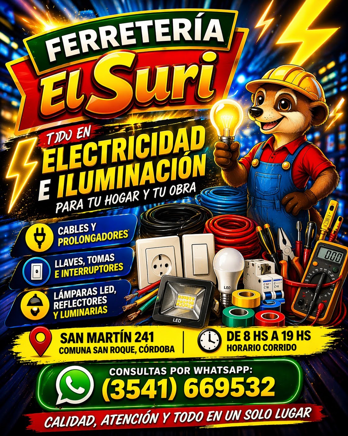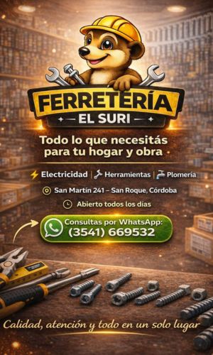 Ubicada estratégicamente en San Martín 241, Ferretería El Suri nace en la Comuna de San Roque para ser el aliado indispensable de cada vecino, hobbista y profesional de la construcción. Nos distingue una atención personalizada y un compromiso absoluto con la calidad de nuestros productos. Entendemos que cada arreglo en el hogar o avance en la obra requiere la herramienta justa, por eso seleccionamos marcas líderes que garantizan potencia y durabilidad. En El Suri, combinamos la calidez de la atención local con un stock profesional, brindando soluciones integrales para que tus proyectos nunca se detengan.