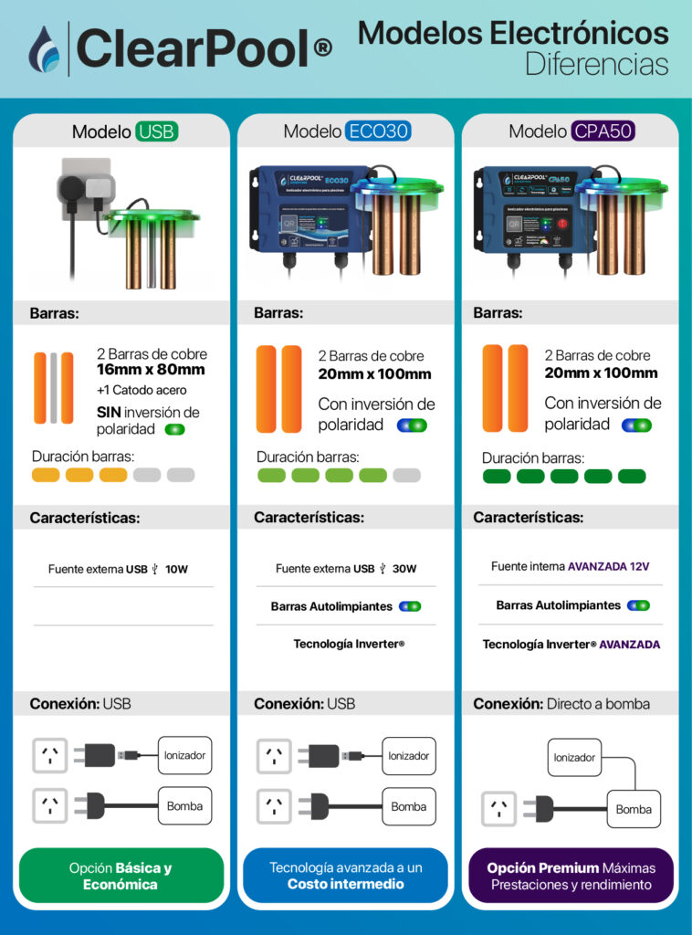 - Aunque los ionizadores reducen casi por completo el uso de químicos, siempre se recomienda mantener un mínimo de desinfectante según el uso y el clima.