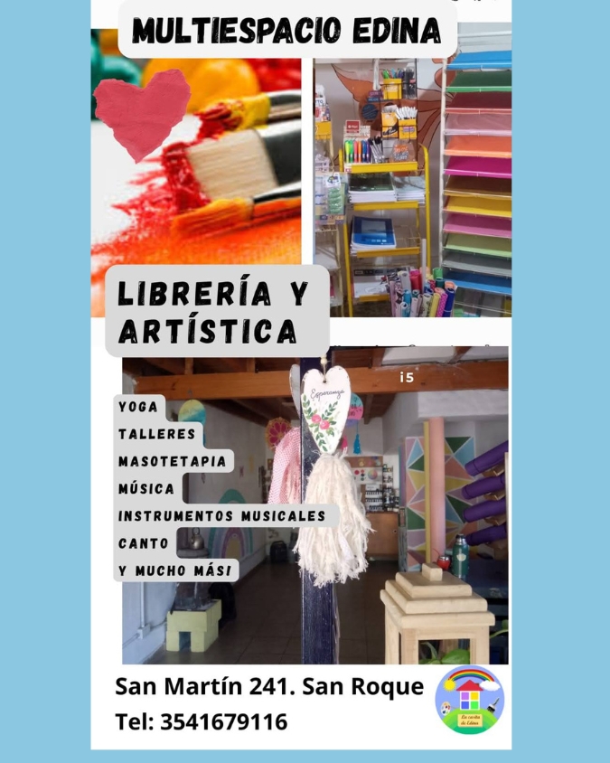 Ubicada en San Martín 241, en la Comuna de San Roque, La Casita de Edina es mucho más que un comercio; es una comunidad vibrante y creativa. Nuestro espacio nació con la misión de ser un punto de encuentro donde el arte, el conocimiento y la salud se entrelazan. Pensada para estudiantes, artistas, emprendedores y familias, nuestra «casita» es un ambiente inclusivo y acogedor donde cada visitante puede encontrar herramientas para su educación, canales para su expresión artística o momentos de relajación profunda. Somos un motor cultural local en constante movimiento, siempre sumando nuevas propuestas para enriquecer la vida de nuestros vecinos.