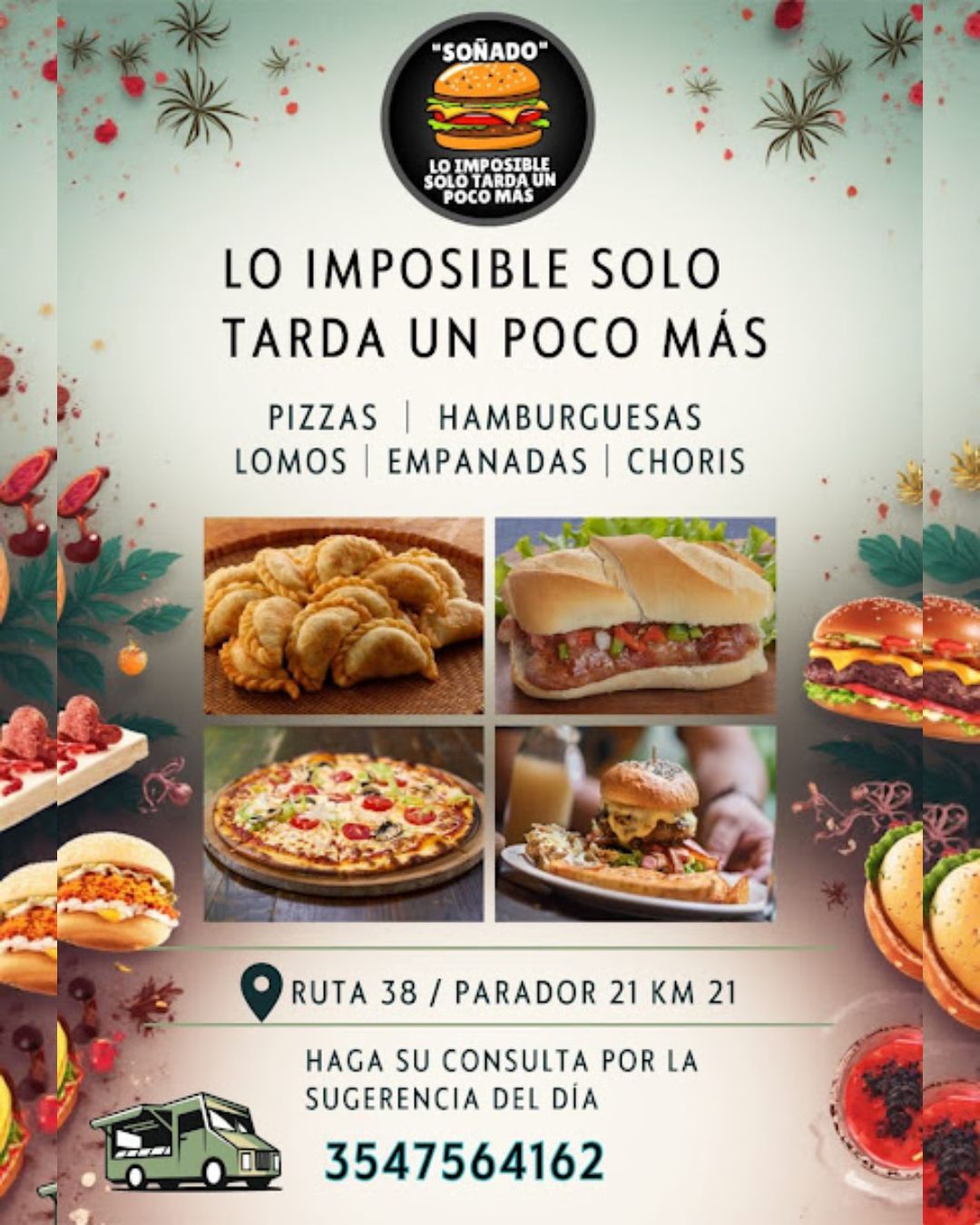 Soñado es un carro de comidas ubicado sobre la Ruta 38 Km 21 en Parque Síquiman, donde el sabor casero, la dedicación diaria y la pasión por lo bien hecho se combinan para ofrecer una propuesta gastronómica simple pero sabrosa. Nació como un proyecto de trabajo y constancia, y con el paso del tiempo se ha convertido en una parada ideal para quienes buscan comidas abundantes, bien preparadas y con espíritu serrano.